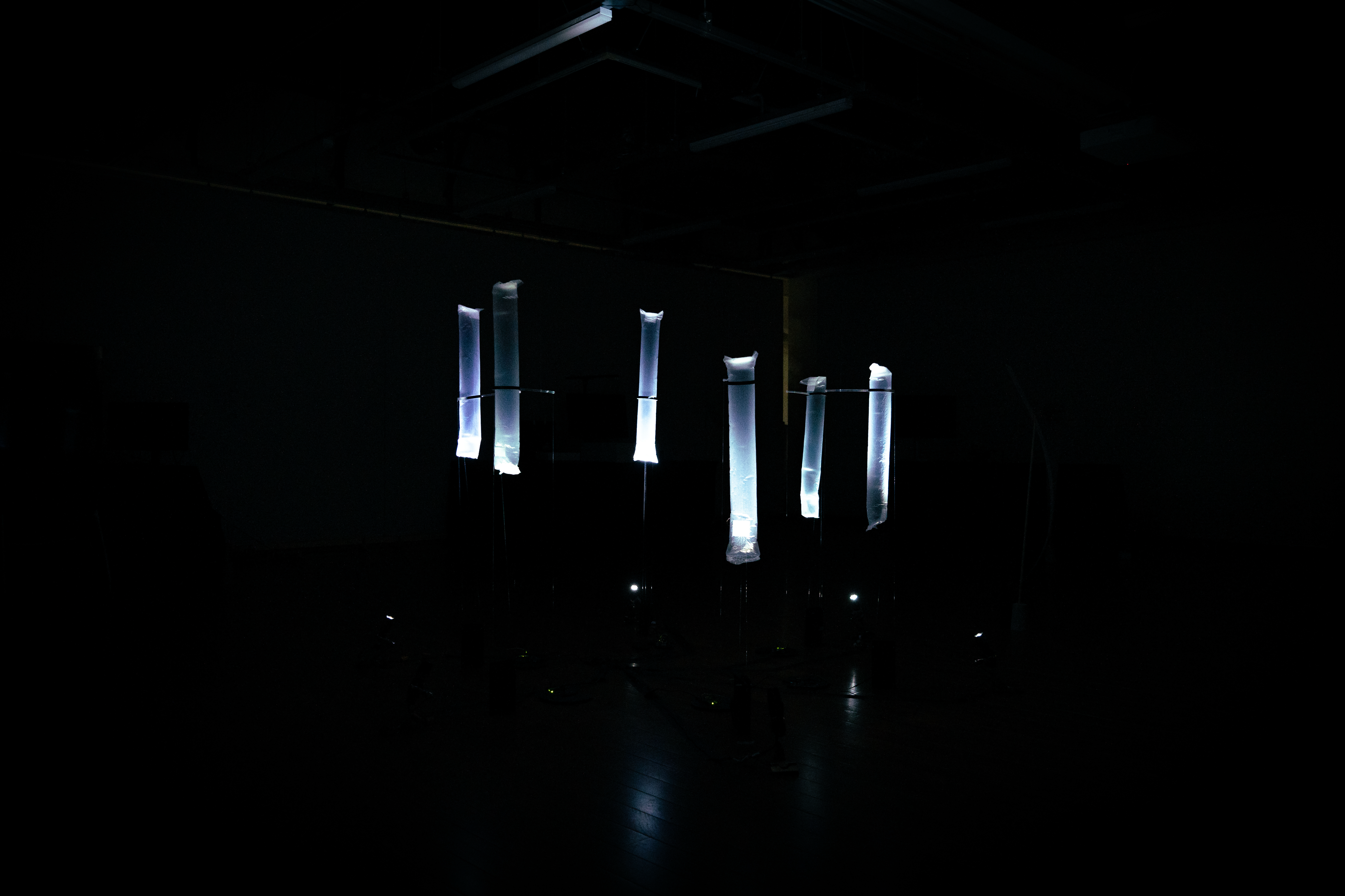 膜によって実体を持った空気が様々な重力感をもって上下に揺れ動き, 独立した振る舞いはあるとき突然揃いはじめる. そんな付いて離れていく不思議な様子を体感してほしい.